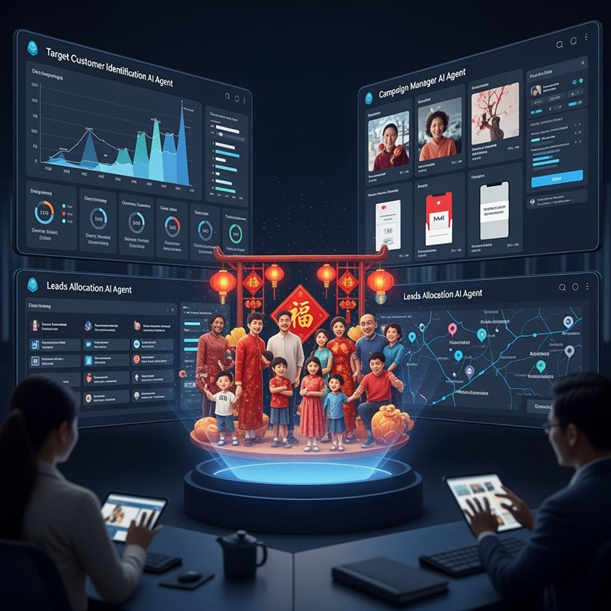 For example, an insurer launching family-themed campaign during Chinese New Year can start off by triggering a “target customer identification AI agent.” This agent would analyze large datasets – including internal CRM, social media, other transaction databases - using deep learning propensity models to micro-segment potential customers by demographics, life stage, family details, and inferred openness to insurance.