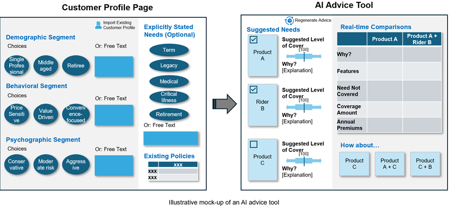An “AI advice tool” can provide preliminary recommendations using pre-filled or inferred customer profile. Advisors will still retain full control and can override suggestions, but widespread use can raise the baseline quality of advice. This tool can also generate side-by-side sales illustrations for collaborative reviews with clients, allowing iterative comparisons of insurance products and rider combinations.
