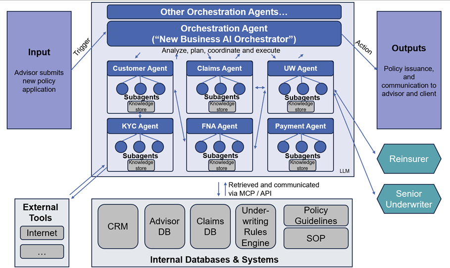 For instance, when an advisor submits an application for an existing client with slightly elevated cholesterol, a “new business AI orchestrator” could triage and coordinate with each specialized agents to: check client records, validate claims history, flag KYC/AML risks, review suitability and recommend bundles, assess underwriting risk and potential loadings or exclusions, and even liaise with reinsurers for approval.